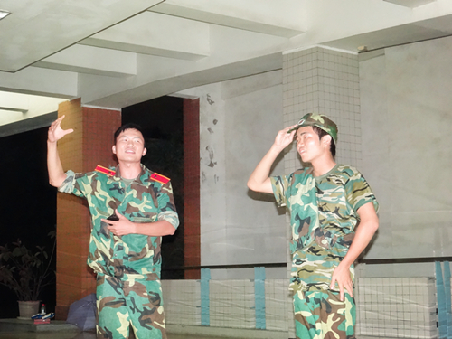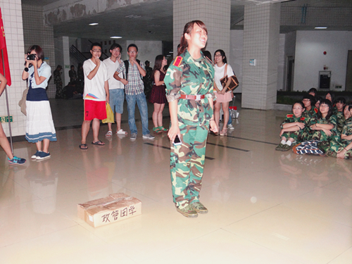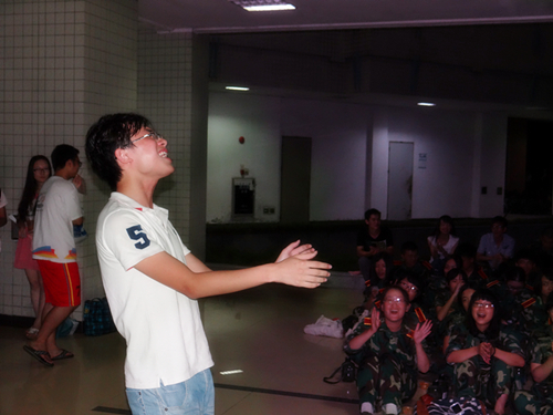 当确认每个人都拿到月饼后,一场别具特色的中秋晚会在五个排新生震耳欲聋的掌声、欢呼声中拉开了序幕。晚会的舞台简陋,灯光略显黯淡,但是阻挡不了新生们的热情和团结。