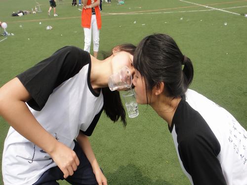水杯接吻游戏无疑是最吸引人眼球的游戏了。每队7个人,派一人在起点往第一位队员嘴巴中衔着的水杯中倒水,第一位队员衔着盛有水的水杯走一米的距离到达第二位队员那里,不借助手的力量,将水杯中的水倒入第二位队员的水杯里,以此类推,最后一名队员需走两米到达指定倒水容器,将水倒入,直到指定容器倒满。看着队员们用嘴叼着杯子的滑稽样,围观群众都纷纷哈哈大笑,选手们自己也忍俊不禁,有倒一半洒出一半的,有直接往对方脸上倒下去的,男女相接的时候造成的错位接吻假象,大家都纷纷举起相机抓拍以留念。