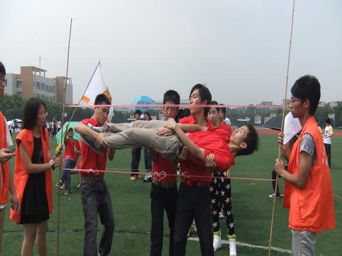 在比赛中,各班级真可谓使尽浑身解数来比赛,欢乐传送带就是每个队员开始站在同一边,队员必须都从拉着的上下两条绳子中间50cm缝隙中传送过去,传送过程中,若队员身体碰到绳子,则将该名队员传送过去之后,派2名队员回到还没有传过去的一边。每个班的策略都相差无几,男生先过去,随后是女生,最后留几个个男生最后。平时不起眼的娇小女生此时占尽了优势,被男生们轻轻松松地抬了过去。各班的同学们都享受着游戏的欢乐。