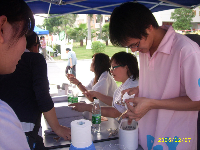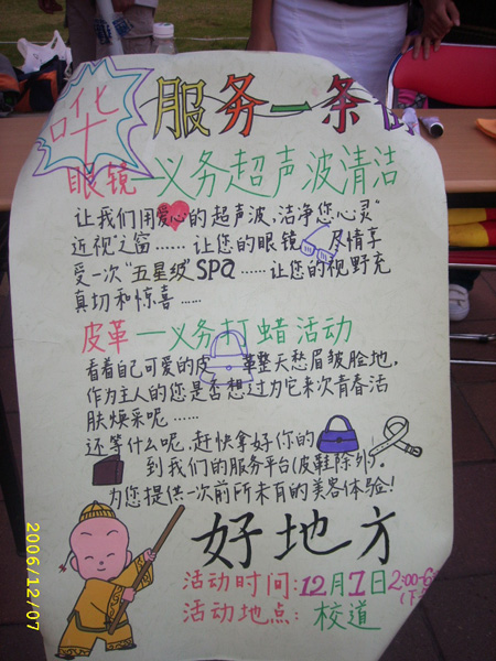 为了响应12月5日的国际志愿者日,12月7号,下午2:00-6:00由公司校团委志愿者行动指导中心统一组织全校各个志愿者组织以集市服务的形式,于本校南北校区校道向广大师生开展"服务一条街"大型服务活动。此次活动受到了广大同学的热情参与,由我们政管公司实践部主办、中大视光眼镜护理中心协办的“义务超声波-清洗眼镜”和“皮革义务打蜡”活动,同学反应也非常热烈。