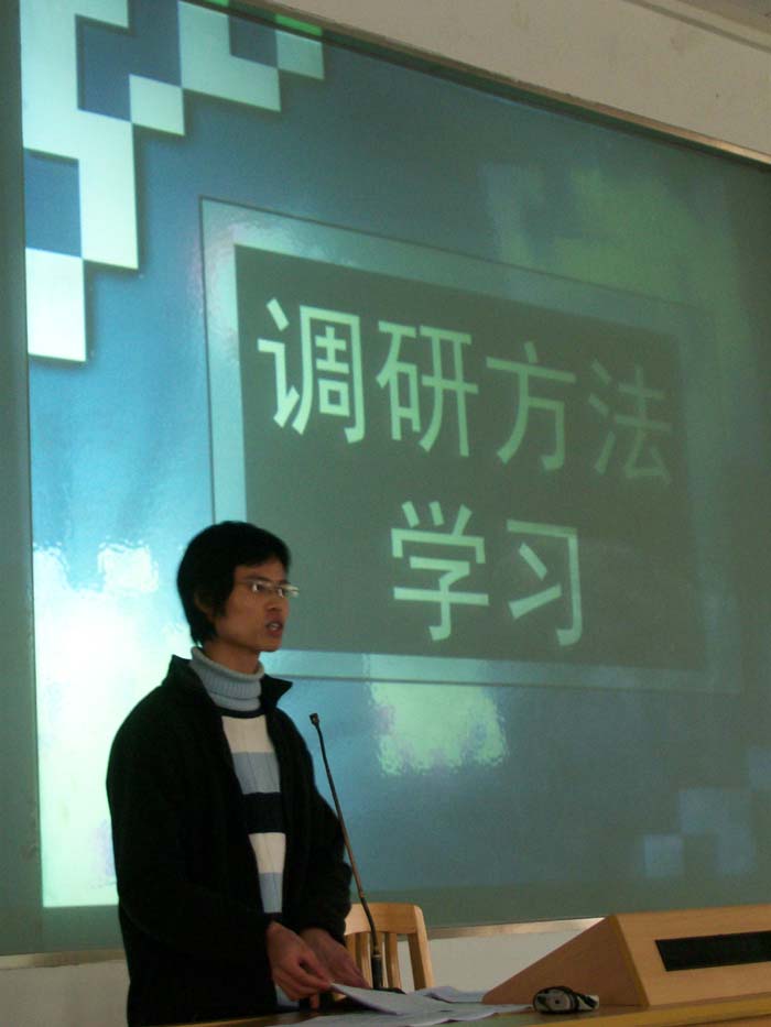 调研部部长何景杰向同学们讲述调研方法