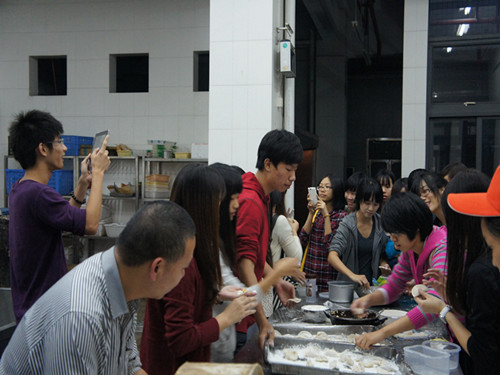 生日会第一个节目:包饺子。你可能吃过饺子,但是你亲自动手包过吗?这时东北来的前任班长竟然高声说:“不会包怎么办啊?”大家一片应和,班长没辙了?哈哈,不可能,早有准备!有请饭堂阿姨!只见一位阿姨默默走近我们的桌边默默地包起饺子来,那些面皮和馅儿眨眼间就被捏成精致可爱的饺子,高手在民间啊。同学们纷纷围在周边照葫芦画瓢地包起来。有心灵手巧的同学一学就会,包起来有模有样,也有贪玩的同学童心大发,将想象与实践相结合,便诞生了一辆宇宙飞船还有一只纠结的小笼包。一盘盘的饺子在大家的欢声笑语中成型了。饺子下锅喽。