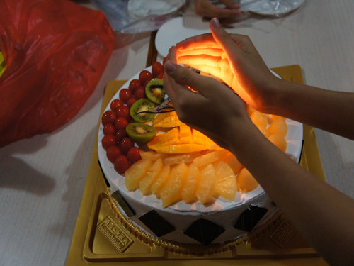 饺子在锅中翻滚时,生日蛋糕到了。于是,大家围坐一团,班长在大家的注视下点燃了一根蜡烛,在温暖的烛光前大家纷纷说出了对11行二的祝福并一齐吹灭了蜡烛。调皮的女生们抢走了蛋糕上的水果,男生们表现得很绅士,呵呵,其实是无奈地退居后面。轮到男生的时候,美味的蛋糕被瞬间消灭。