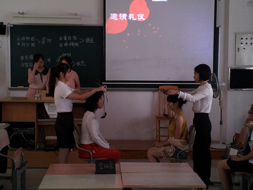 行二的孩子们盼星星盼月亮终于盼来了这个星期三早上的公共课。今天又是一个特别难忘的presentation,蔡老师在前两个星期就给我们布置了一个关于公关礼仪的任务:每一个小组在10分钟内除了要展示礼仪的基本内容外,还要在课前打理好个人形象,正式着装,在课上展现最好的自己。