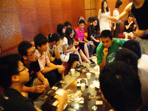 晚上8时许,大家就陆陆续续到达水榭K房啦,一进去,我们班的张俨同学就迫不及待来了一首《七友》,把包厢的气氛点燃,大家也就顾不了平时矜持的形象啦,点歌的点歌,唱歌的唱歌,桌游的桌游,玩“傻瓜”游戏的也动起来了,大家真是“忙得”不亦乐乎。