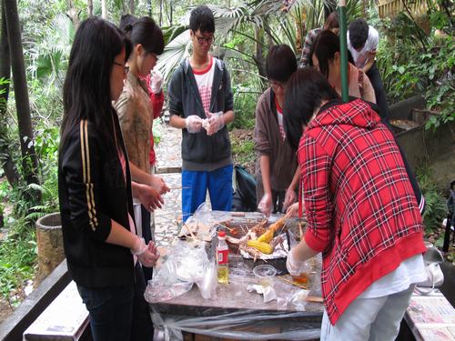到达大夫山森山公园,大家前往烧烤场,开始今天的第一环节——烧烤,目的是建设和谐、团结的班集体。在烧烤前,洗菜,租炉,买碳,起火等各项准备工作大家分工进行。烧烤时,有的人忙着串丸子,有的人忙着唱歌营造气氛,有的人忙着烧烤,有的人忙着拍照记录等等,不过大家都有得吃,这就是分工合作的结果,每个人都乐在其中。