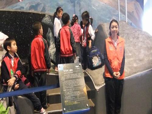在场馆里,大多时间里我们的工作都是在当临时摄影师为小朋友拍照,为他们解释设施的用法和为他们指路。其他时间我们一般是在馆内流动站岗,看哪里的游客需要我们的帮忙及指引就上前为其服务。工作简单而有些乏味,但我们几个站岗的志愿者却始终热情不减,总是面带微笑、耐心地为小朋友及其他游客进行讲解、指引等重复的工作。这也许就是所谓的志愿精神吧!在帮助他人的同时,我们的内心也获得了极大的满足感,我想这也是我们社工助人自助宗旨的一种体现。