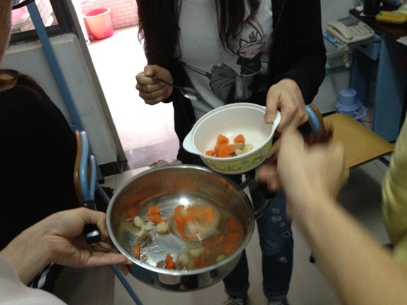 中午,大家像往常上完课吃完午餐都回宿舍休息了,但是男生那边,却在这时忙个不停——那是男生们正在为我们准备的热腾腾的汤,排骨和胡萝卜的香气从远远的7栋一直延伸到我们女生宿舍门口。他们亲自将爱心汤送到女生宿舍并进行悉心“慰问”,让我们在早餐的美味还没褪尽的时刻,再一次体会男生的温柔和贴心。