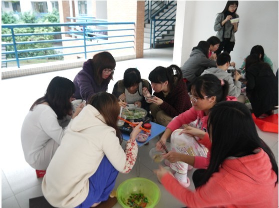 有的小组把火锅料放进锅里,开足火力,大家就以闲聊来打发等待的时间,只是目光依旧停留在锅上,时刻密切注视着锅里的动静,磨刀霍霍向猪羊,随时做好了抢肉大战的准备。有的同学更机灵了,总能在适当的时间出现在适当的地点。掀开锅盖,别的小组也跑过来蹭肉吃。现场一片闹哄哄的,很有过年的感觉,大家像小孩子一样淘气、嘴馋。